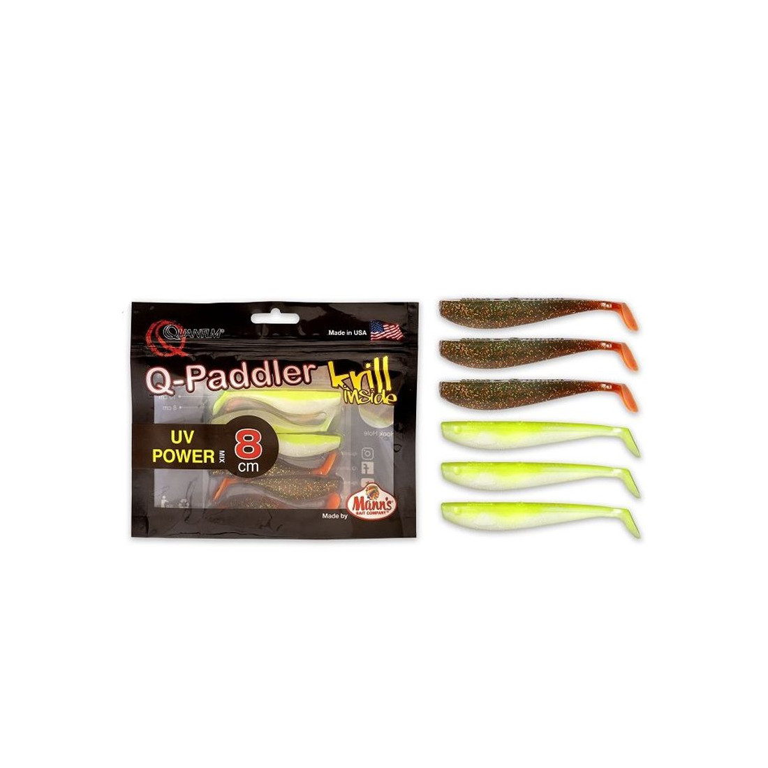 Mann's Q-Paddler este un set de shad-uri, realizate dintr-un material moale, calitativ, si se vor preta excelent pe rigorile pescuitului la spinning. Aspectul nalucilor este unul extrem de natural, ce va face ca rapitorii sa atace decisiv. Evolutia este una realista, similara cu a unui pestisor prada ranit, aceasta miscare datorandu-se paletei de dimensiuni mici, dar proiectata pentru a avea o miscare agresiva.